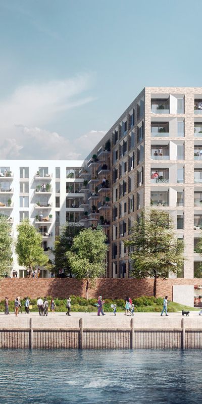 Die Bebauung besteht aus drei aneinander angrenzenden Baukörpern mit bis zu acht Obergeschossen. Diese sind auf einem gemeinsamen Warftgeschoss angeordnet, das als hochwassersicheres Sockelgeschoss ausgebildet ist und den besonderen Anforderungen des Standorts in unmittelbarer Elbnähe gerecht wird. Durch die kompakte Blockstruktur entsteht ein klar gefasster Innenbereich, während sich die Gebäude zur Wasserseite hin öffnen und attraktive Blickbeziehungen zur Norderelbe ermöglichen.