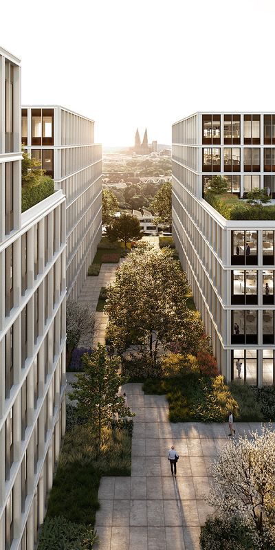Das Büroquartier Q111 in Köln umfasst vier Gebäude mit bis zu sieben Geschossen, die auf einer gemeinsamen zweigeschossigen Tiefgarage mit rund 700 Stellplätzen angeordnet sind. Mit Gebäudehöhen von bis zu 26 Metern bildet das Ensemble einen markanten und zugleich klar strukturierten Bürostandort.
